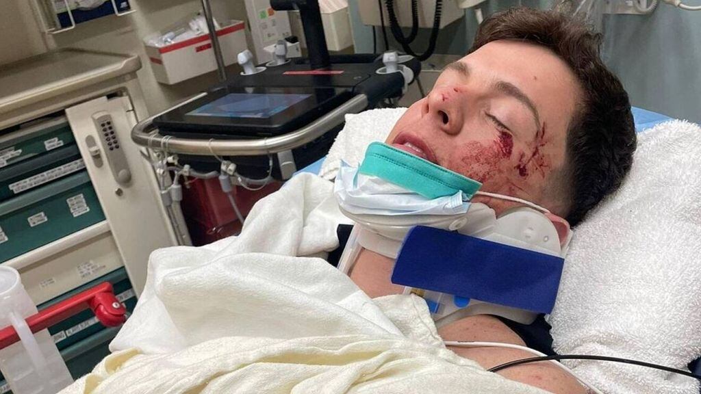 El intérprete de “Rebota” compartió varias instantáneas desde el hospital con un collarín como consecuencia de haber sufrido un fuerte impacto durante el choque.