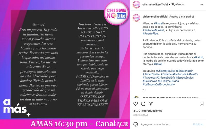 “Anuel eres un puerco. Tú y toda tu familia, no tienes moral y mucho menos vergüenza”, inicia el texto.