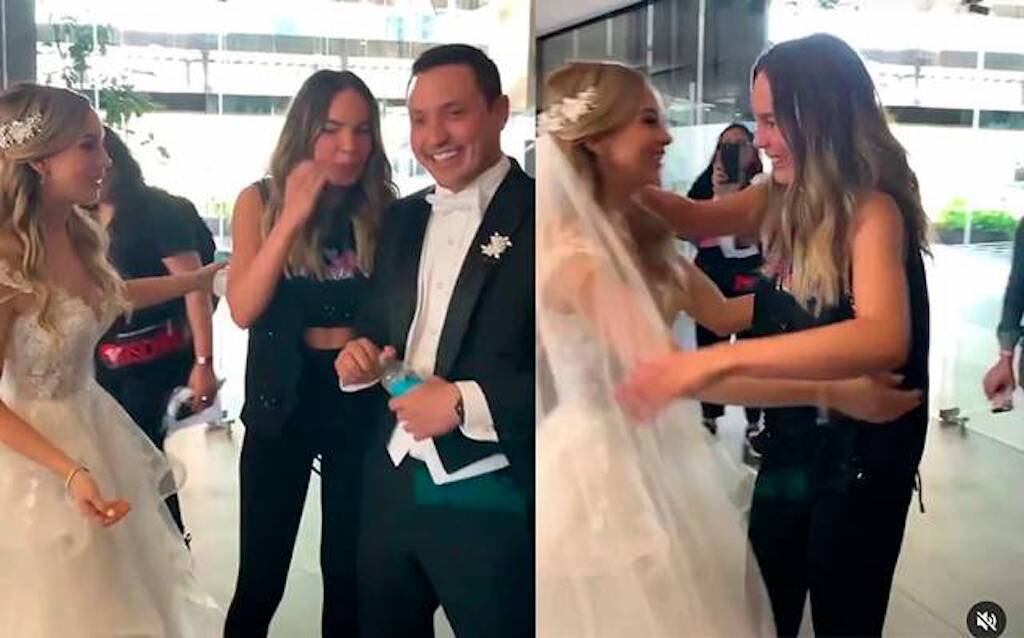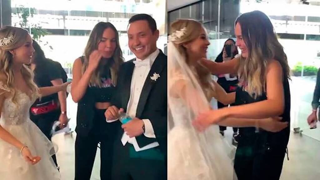 La sencillez de la cantante y la emoción de los novios quedó registrada en un video que ya le está dando la vuelta a las redes sociales. En la grabación se puede apreciar el momento en que Belinda camina con todo su equipo de producción cuando nota la presencia de la novia recién casada con su vestido blanco y ambas reaccionaron emocionadas.