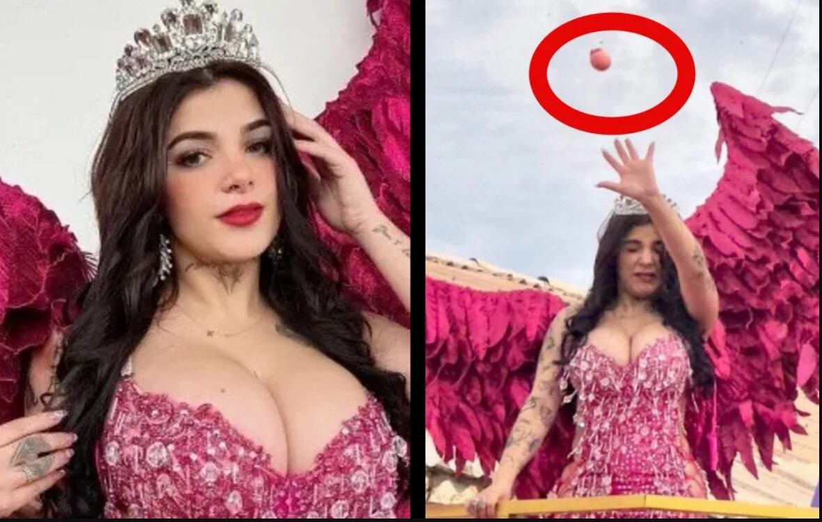 A través de videos e imágenes que han circulado en redes sociales, se puede ver que ella en un gran carro alegórico bailando y usando un vestido color rosa con cristales, cuando de pronto le avientan huevos, uno de ellos cae en su escote y ella niega con su cabeza en señal de desaprobación, pero continúa bailando.