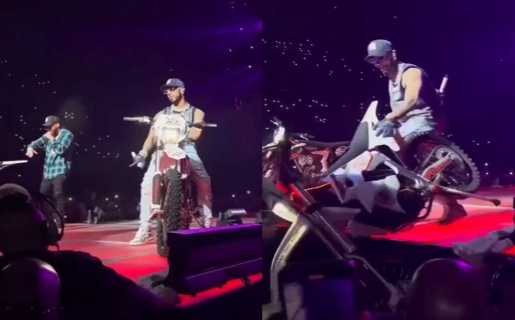 El hecho ocurrió en un concierto que el cantante del género urbano ofreció en Nueva York, Estados Unidos. Mientras intentaba hacer una entrada impresionante en su motocicleta, perdió el control al intentar bajarse y el vehículo se deslizó hacia el borde del escenario.