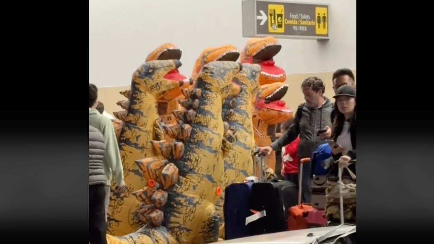 En el material audiovisual se puede ver a varias personas disfrazadas de dinosaurios en el Aeropuerto Internacional La Aurora. Todo se trató de un inusual recibimiento de un pasajero por parte de sus seres queridos, quienes decidieron sorprender de esta manera.