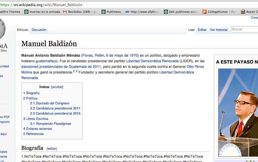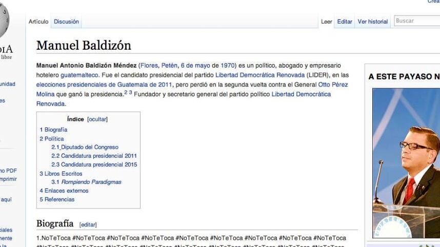 Una de las páginas que ha sido editada durante los últimos días ha sido la de Manuel Baldizón, candidato a la presidencia por Líder. En cada una de las descripciones de este perfil se ha colocado la frase “no te toca”, que ha sido la respuesta de algunos guatemaltecos a la campaña de esta agrupación denominada “Le toca a Guatemala”.