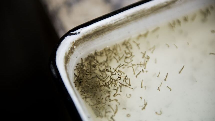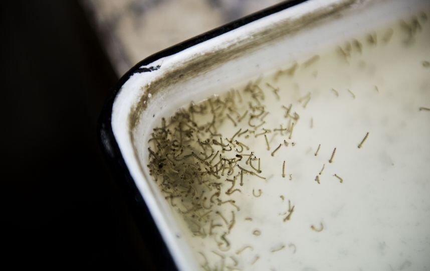 La temperatura es de 35 grados dentro del insectario de Salud y el encargado, Alfonso Cruz, recolecta las larvas que en unos días se volverán los mosquitos del género aedes, que infectan el virus zika con una picadura.
