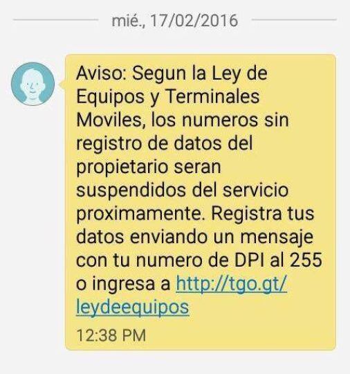 Recientemente, usuarios de telefonía móvil reportaron haber recibido inusuales mensajes de texto que indicaban que aquellos números sin registro serían suspendidos, y que para evitarlo debían debía enviar su número de DPI al número 255.