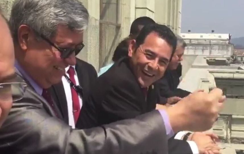 El vicepresidente, Jafeth Cabrera, estuvo junto al mandatario, Jimmy Morales en el palco del Palacio Nacional de la Cultura para ver el paso del desfile bufo de la Huelga de Todos los Dolores de la Universidad de San Carlos de Guatemala, pero no se resistió a hacer una “mala seña” para responder a las consignas que le gritaban.