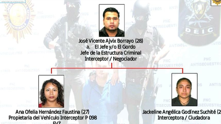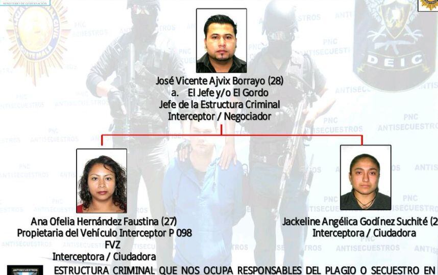 El comando antisecuestro de la policía, en coordinación con fiscales del MP, capturó a los esposos José Vicente Ajvix Borrayo de 28 años de edad y Ana Ofelia Hernández Faustina de 27, así como de Jackeline Angélica Godínez Suchité, de 26, por el delito de plagio y secuestro.