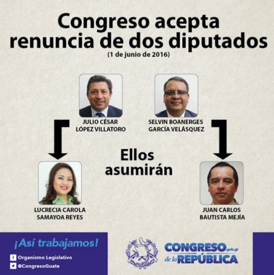 Juan Carlos Bautista ocupará la curul de García y Lucrecia Carola Samayoa Reyes la de López Villatoro.