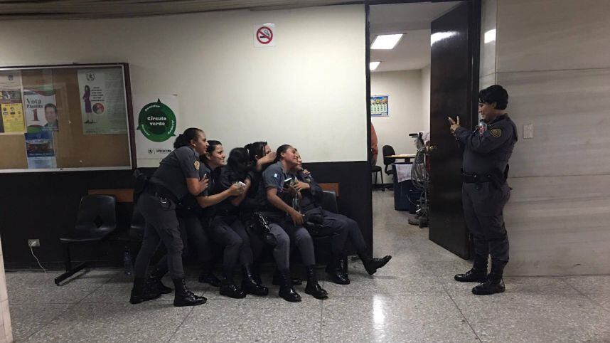 Las jornadas en la Torre de Tribunales son extensas y agotadoras. Aún así, un grupo de mujeres, guardias del Sistema Penitenciario (SP) tienen una manera de “pasar” el tiempo y dejar constancia con una foto grupal. Las guardias han sido captadas previo a una audiencia.