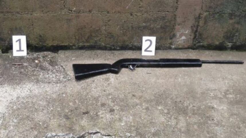 Durante un allanamiento donde se reportó la captura de dos hombres acusados de asesinato en Barberena, Santa Rosa, la Policía Nacional Civil (PNC) logró rescatar un arma de fuego que fue escondida en una letrina.