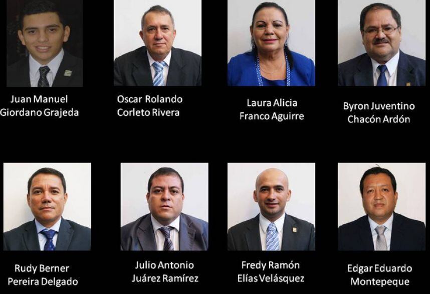 Los congresistas señalados por el Ministerio Público de abuso de autoridad, discriminación, tráfico de influencias y concusión son Juan Giordano, Laura Franco, Óscar Corleto, Rudy Pereira y Edgar Montepeque. También están Julio Antonio Juárez, Byron Chacón y Ferdy Elías