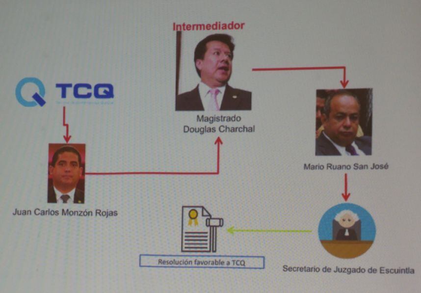 El caso específico contra el magistrado de la CSJ es que, según el MP, se apoyó en el operador Mario Ruano San José para lograr una resolución favorable para la empresa Terminal de Contenedores Quetzal (TCQ) en el juzgado de Escuintla, a petición de Juan Carlos Monzón.