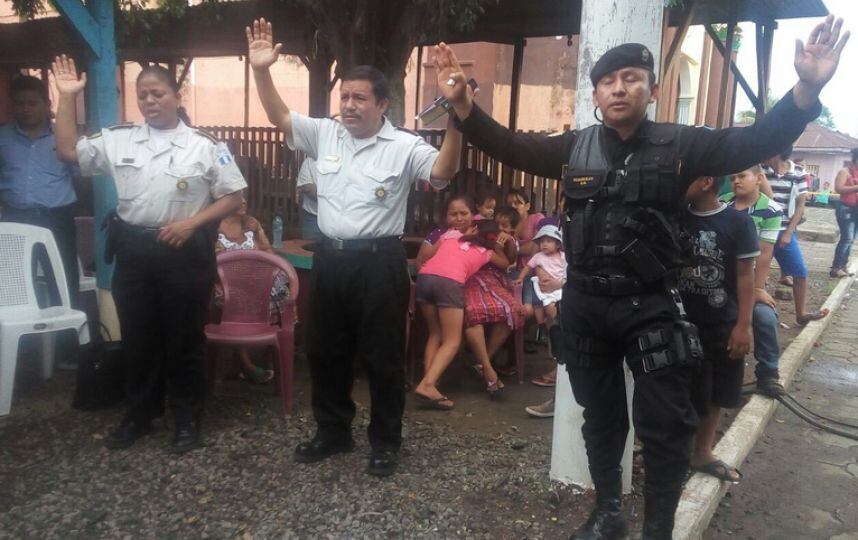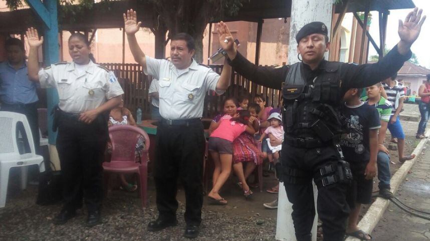 Varios agentes de la Policía Nacional Civil (PNC) participaron en actividades que organizaron los vecinos de San Lorenzo, Suchitepéquez, entre ellos en un acto religioso.