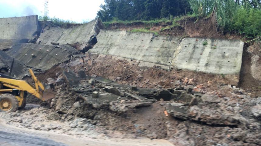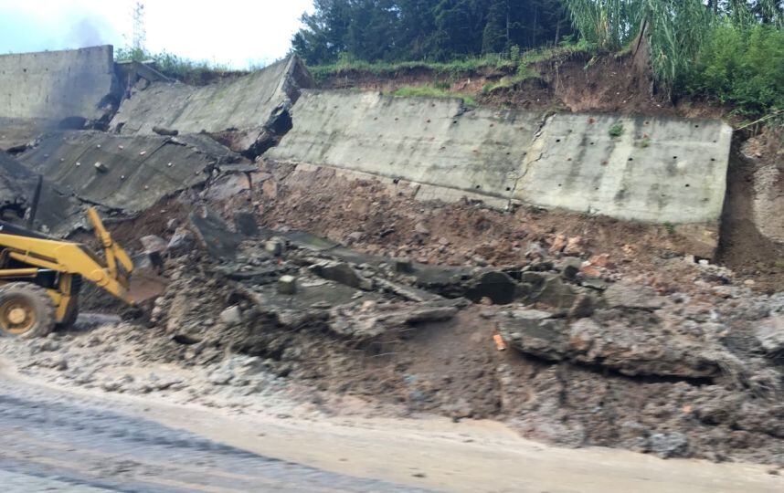 El ingreso al pueblo en San José Pinula está bloqueado debido a un derrumbe que ocurrió por la lluvia de esta tarde.