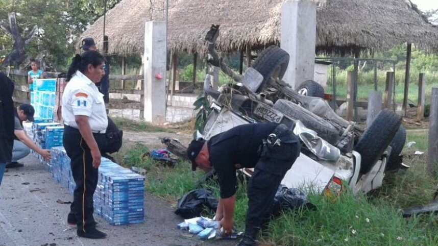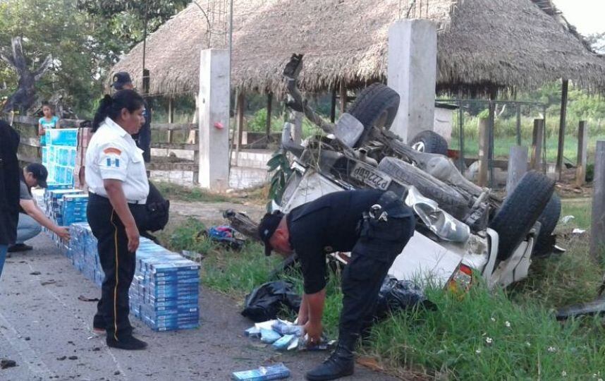 Automovilistas han reportado a los Bomberos Voluntarios de un accidente vial en la carretera que conduce a Poptún, en Petén. Agentes de la Policía han acudido y se han sorprendido porque la mercadería que se transportaba era de contrabando.