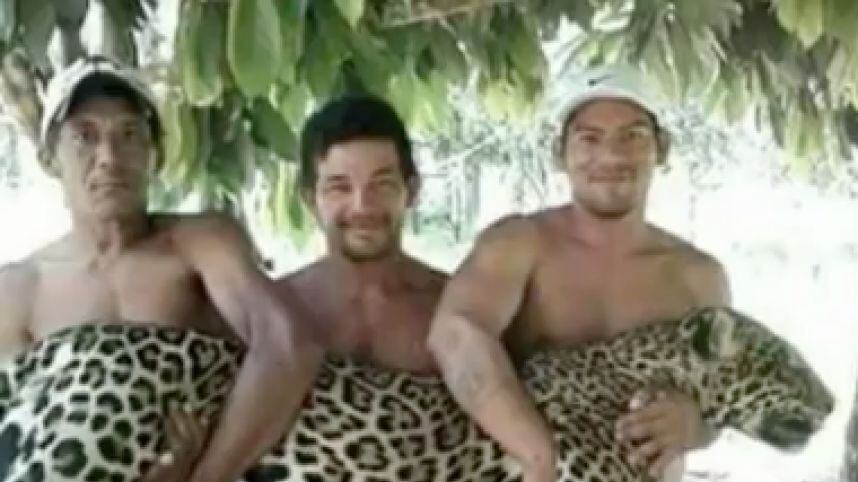 Los tres hombres “juegan” y “posan” en distintas posiciones para una cámara con el cuerpo del felino.