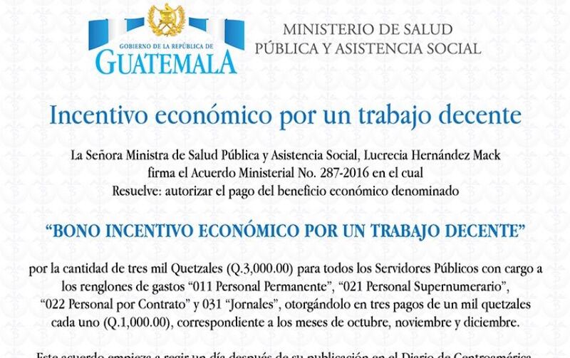 Lucrecia Hernández, titular del Ministerio de Salud Pública y Asistencia Social, otorgó un bono incentivo de Q3 mil a más de 10 mil empleados por realizar “un trabajo decente”.