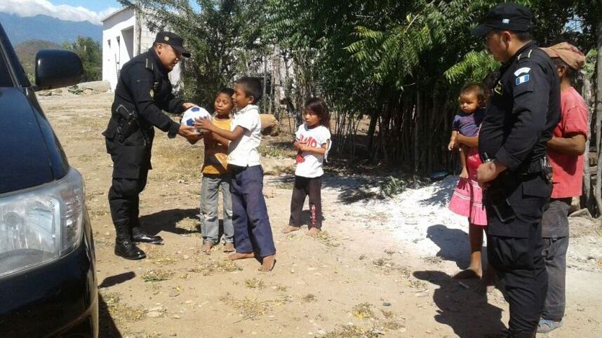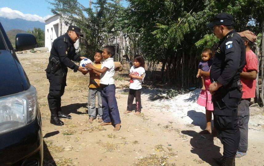La Policía compartió algunas fotografías de un grupo de niños, descalzos, que recibieron como regalo unas pelotas en Zacapa, el oriente de Guatemala.