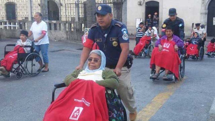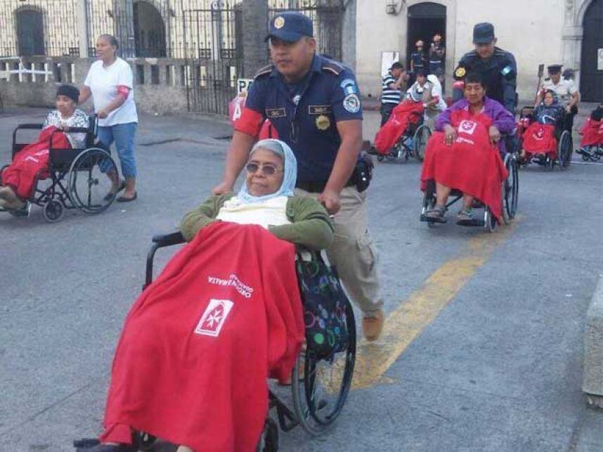 Agentes de la Policía Nacional Civil (PNC) colaboraron hoy con la Orden de Malta para llevar a varios ciudadanos enfermos y con capacidades especiales a asistir al Templo de Santo Domingo, en la zona 1 capitalina.