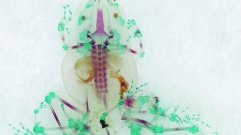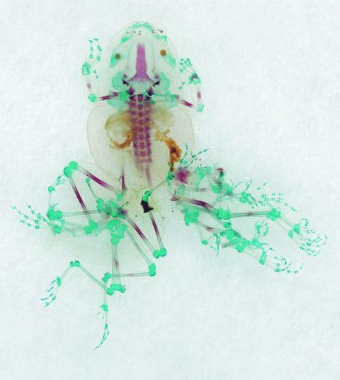 Estas ranas deformadas han sido coleccionadas en mi campo de estudios que he realizado en Estados Unidos, Australia, Asia y Europa. Uso encimas biológicas para dejar sus tejidos transparentes e inyectar colorantes en sus huesos y órganos. Después coloco los especímenes en formas que aparenten movimiento y capturo la imagen con un escáner de alta resolución. Imprimo estas fotografías usando tintas con agua en papel especial para evocar las paletas de color del siglo XIX.