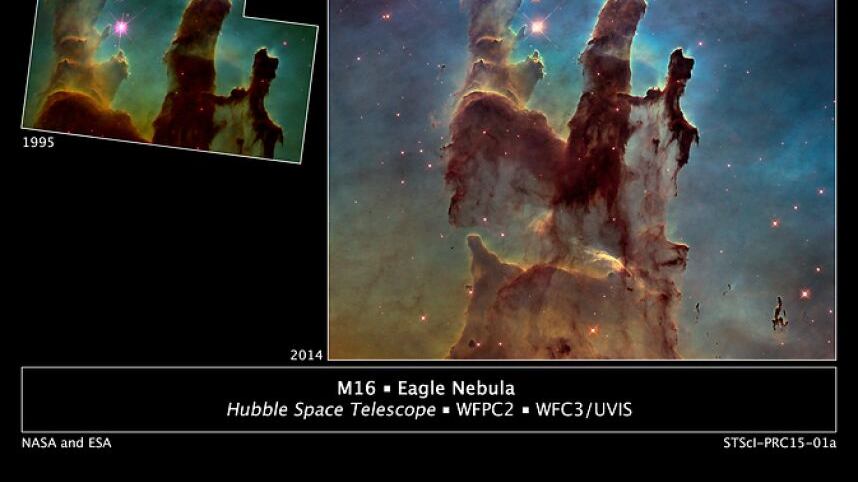 El próximo abril, el telescopio espacial Hubble cumplirá 25 años y ha comenzado a celebrarlo desde ahora. La Administración Nacional de la Aeronáutica y el Espacio (NASA, por sus siglas en inglés) ha publicado en redes sociales una nueva fotografía de los “Pilares de la Creación”, capturados originalmente en 1995.