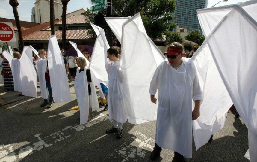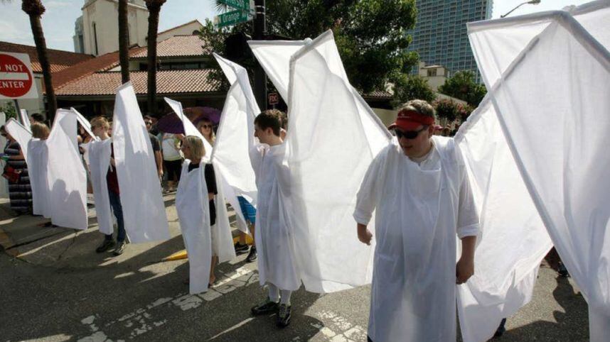 Sin embargo, lo que sorprendió a todos fue la vestimenta que los activistas en favor de la diversidad sexual utilizaron para apoyar: Se vistieron de ángeles. Estos seres de la guarda protegieron el funeral del ataque de los homófobos.