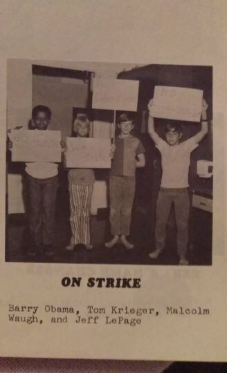 Esta es la historia que está destacando en el portal de internet “Reddit”, en donde se publicó la siguiente fotografía con el título “Obama en el anuario escolar de mi papá, protestando en contra de la tarea”.