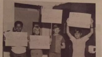 En la fotografía se puede ver que los niños sostienen pancartas; de izquierda a derecha los menores son: Barry Obama, Tom Krieger, Malcom Waugh y Jeff LePage.