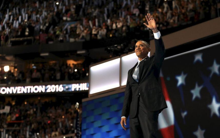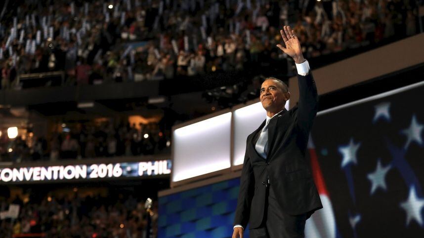 El presidente y la candidata presidencial –exsecretaria de Estado bajo la administración de Obama– caminaron hasta encontrarse de frente y confundirse en un fuerte abrazo que sirvió como evidencia del equipo que ambos han formado. Acto seguido, Obama y Clinton levantaron juntos las manos unidas, en señal de victoria, en señal de equipo y en señal simbólica de que el bastón del Partido Demócrata está oficialmente en manos de Clinton.
