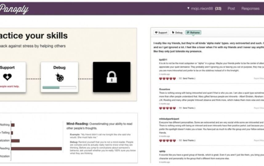 "Panoply" funciona enseñando a los usuarios una herramienta terapéutica llamada reevaluación cognitiva: Cuando una persona está estresada, escribe lo que le está causando problemas y sus reacciones. Luego, la "multitud" le responde ofreciendo una perspectiva contrastante.