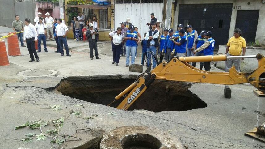 Las lluvias del domingo por la noche provocaron el colapso de un drenaje en la vía principal del asentamiento más grande del país Mario Alioto López Sánchez, en la zona 4 de Villa Nueva.