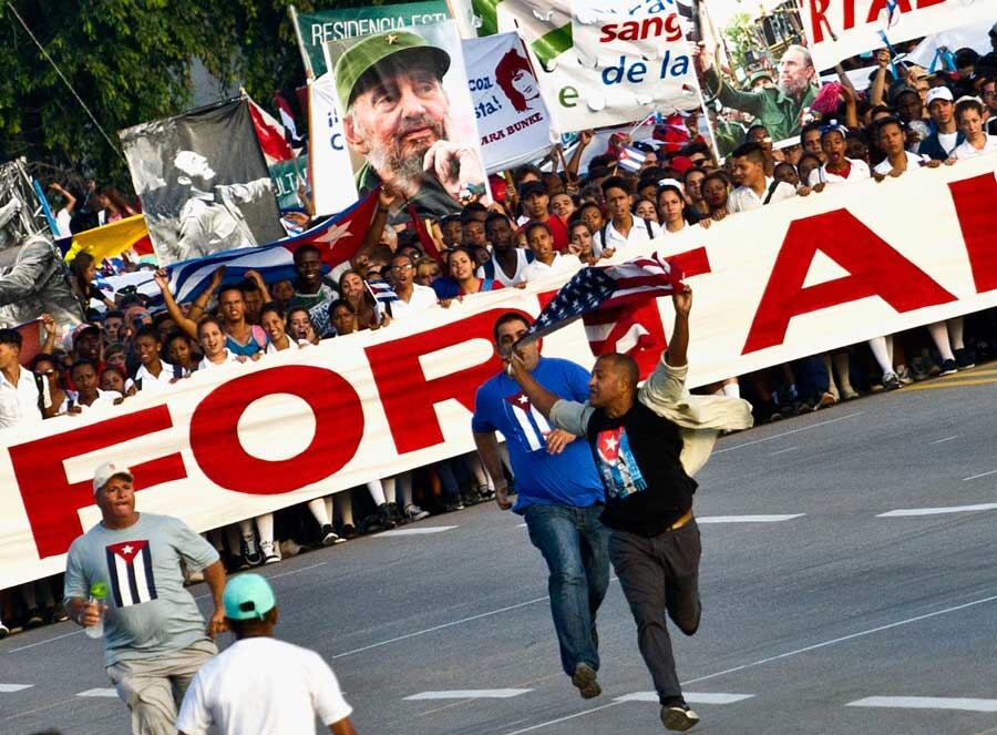 Un manifestante corrió delante de la marcha anual del Primero de Mayo en Cuba ondeando una bandera estadounidense, antes de ser detenido.
