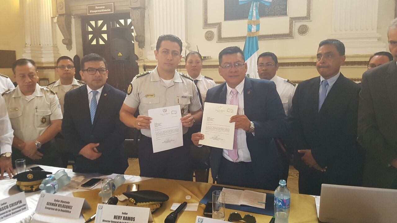 El director de la PNC, Nery Ramos; y el subdirector General de Investigación Criminal, Stu Velasco, acudieron hoy al Congreso de la República para participar en la presentación de la referida iniciativa de ley.