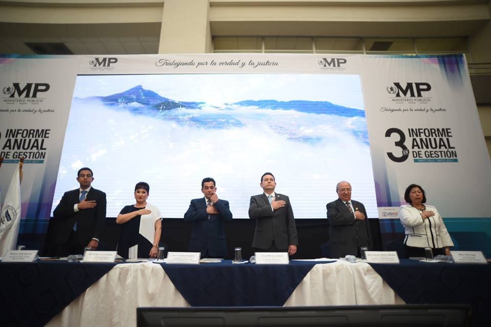 En la mesa principal estuvieron presentes: Aldana, el mandatario Jimmy Morales; el presidente del Congreso de la República, Oscar Chinchilla; el presidente del Organismo Judicial y Corte Suprema de Justicia, Nery Medina; la secretaria general del MP, Mayra Véliz; y el secretario de Política Criminal, Rootman Pérez.
