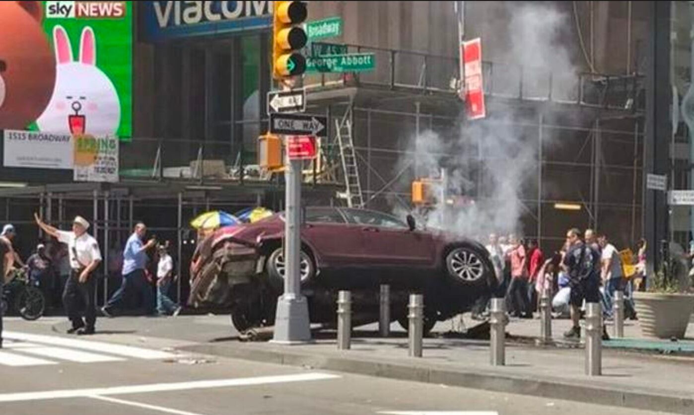 Se puede ver como los peatones caminaban tranquilos en la séptima avenida con la calle 43 cuando el vehículo se subió a la acera a gran velocidad.