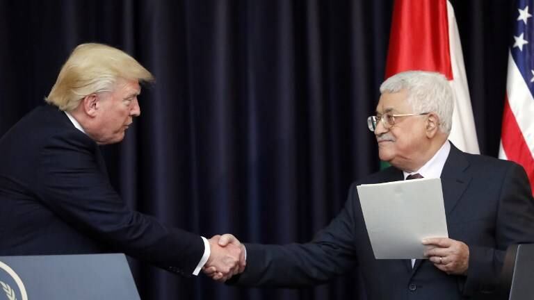 Donald Trump fue recibido por Mahmud Abas en el palacio presidencial de Belén, a tan solo 20 minutos de Jerusalén pero detrás del polémico muro de separación erigido por Israel.