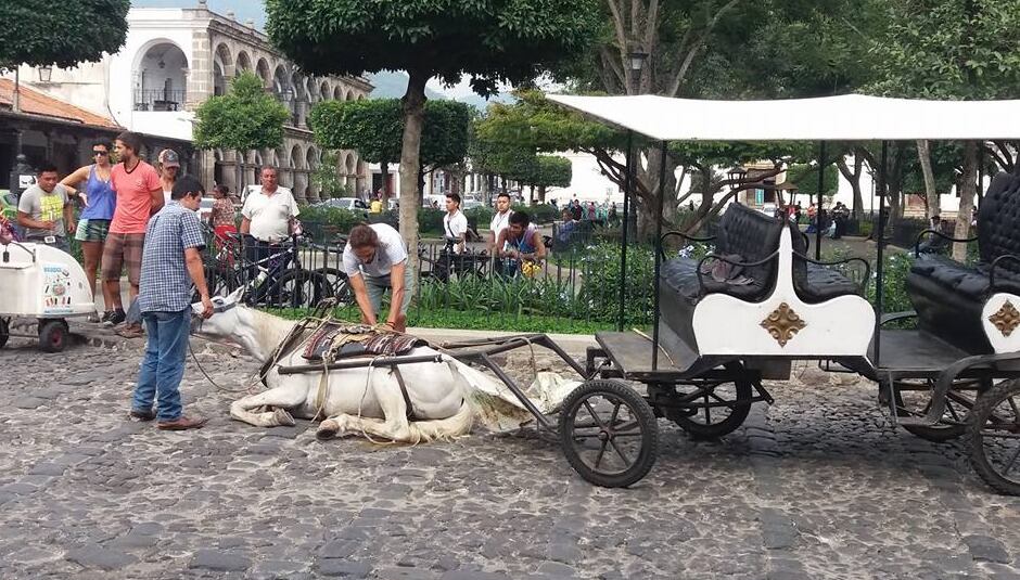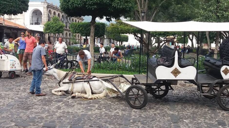 La impotencia se apoderó de una joven en redes sociales, quien denunció haber presenciado cómo un caballo se desplomó frente al Parque Central en La Antigua Guatemala.