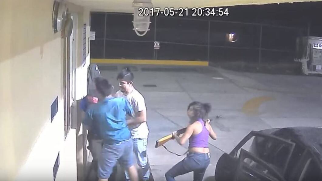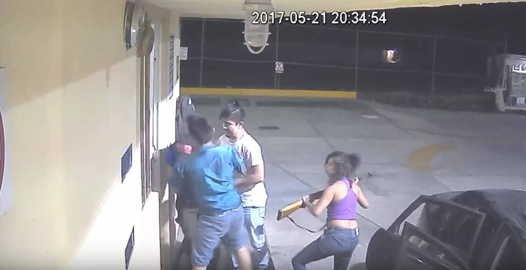 Una mujer, vestida con una camiseta de color morado, también baja del vehículo y recibe en sus manos un rifle, con el que amenaza a los dependientes de la gasolinera.