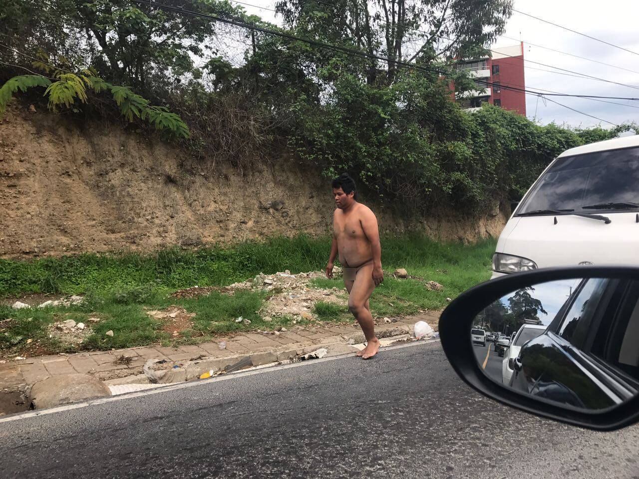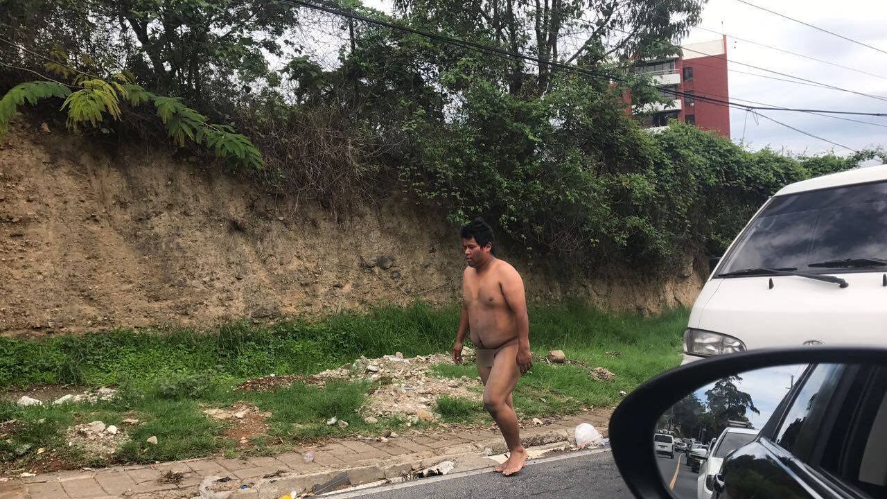 Usuarios en redes sociales compartieron imágenes de un hombre sin ropa que caminaba por la 20 calle, en la zona 10 capitalina. El hombre caminaba apresurado y sin rumbo a la par de los carros.