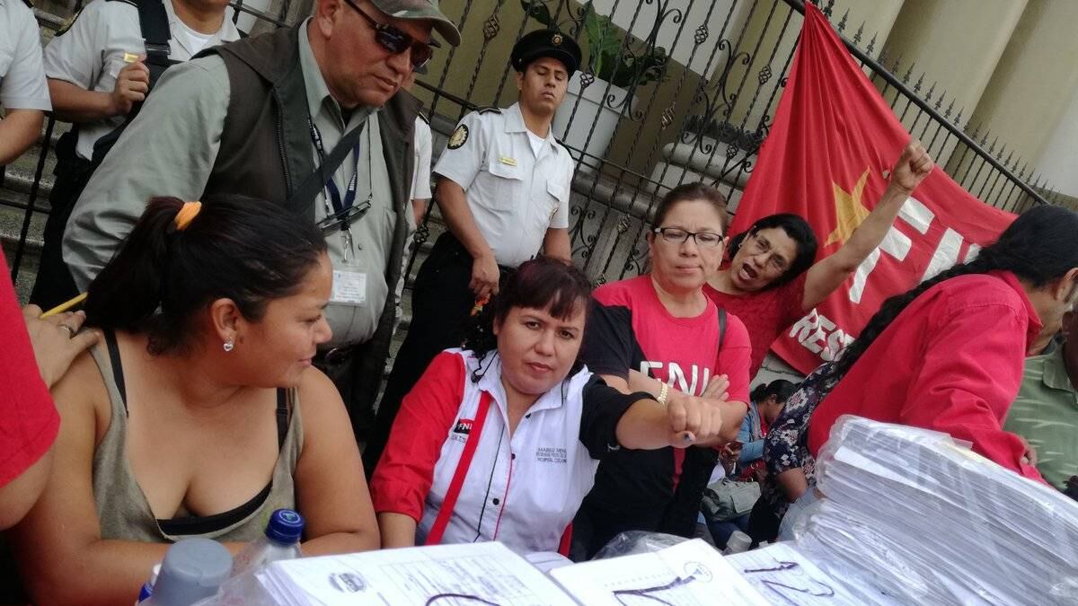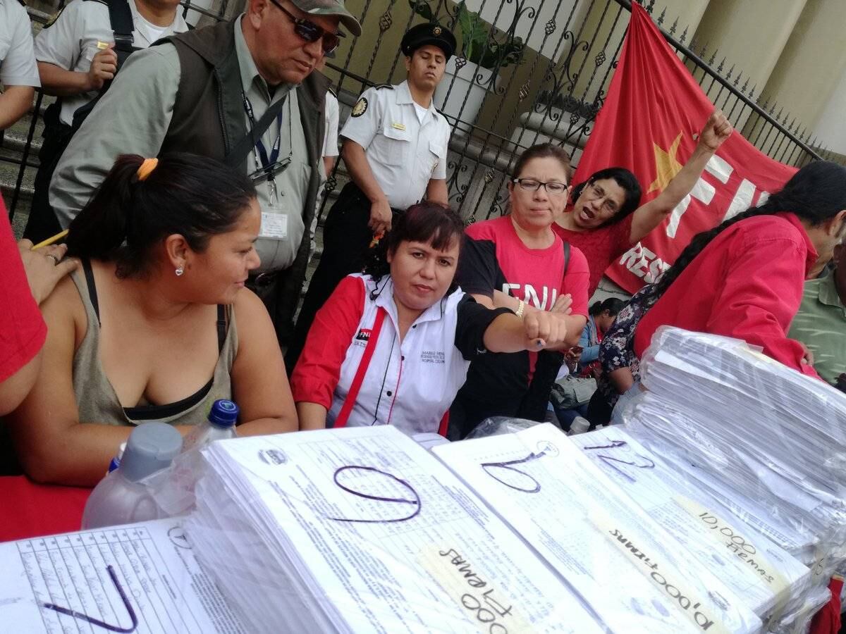 Luis Alpírez, secretario general del SNTSG, explicó que en total fueron presentados 18 paquetes de hojas con las firmas de pacientes y ciudadanos en general, para rechazar la falta de medicinas e insumos en los centros asistenciales.