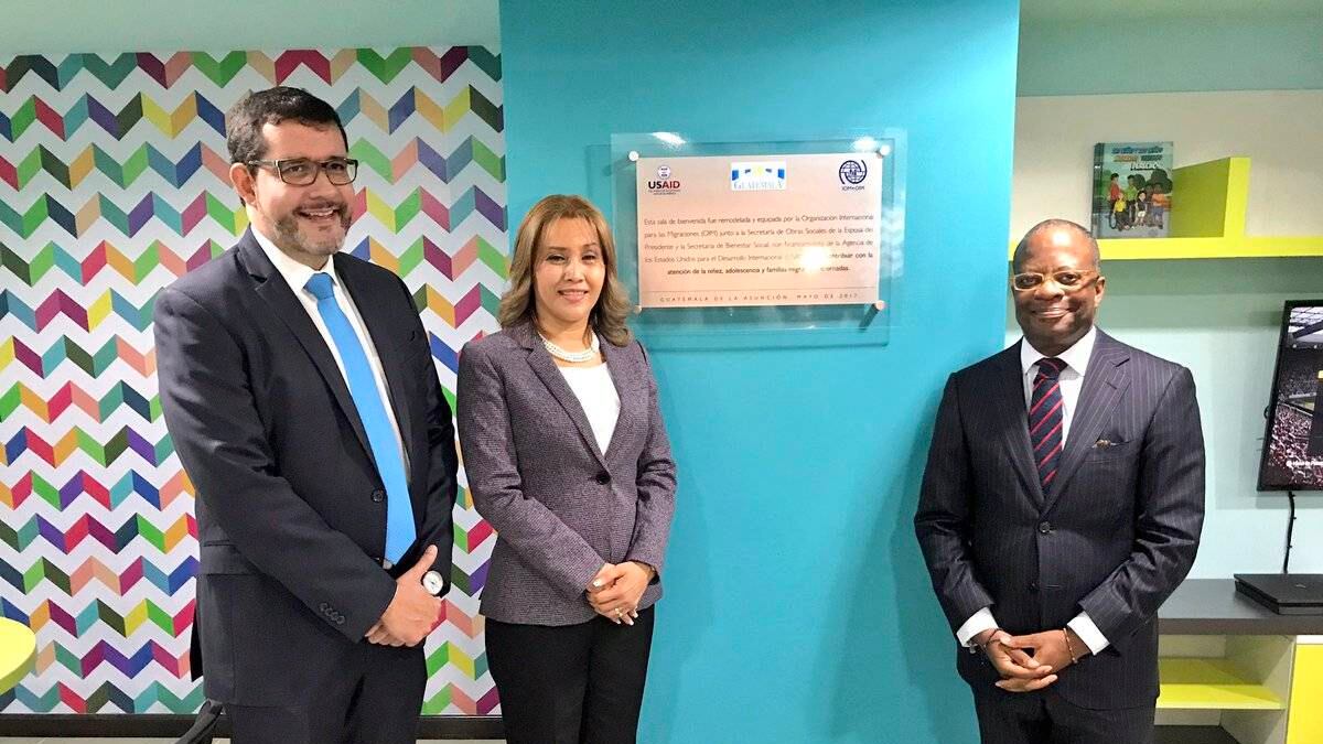 En una de las salas del Aeropuerto Internacional La Aurora, el Organismo de las Naciones Unidas para la Migración (OIM) y autoridades de gobierno inauguraron la sala de bienvenida de niños y adolescentes migrantes no acompañados y unidades familiares.