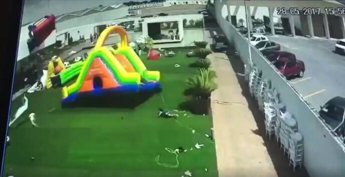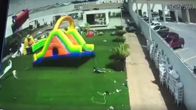 En la grabación se observa a un grupo de niños jugando alrededor y sobre el inflable, cuando de pronto un ventarrón lo arrastra y se lleva a varios niños consigo. Los padres, desesperados, corren para rescatar a los niños.
