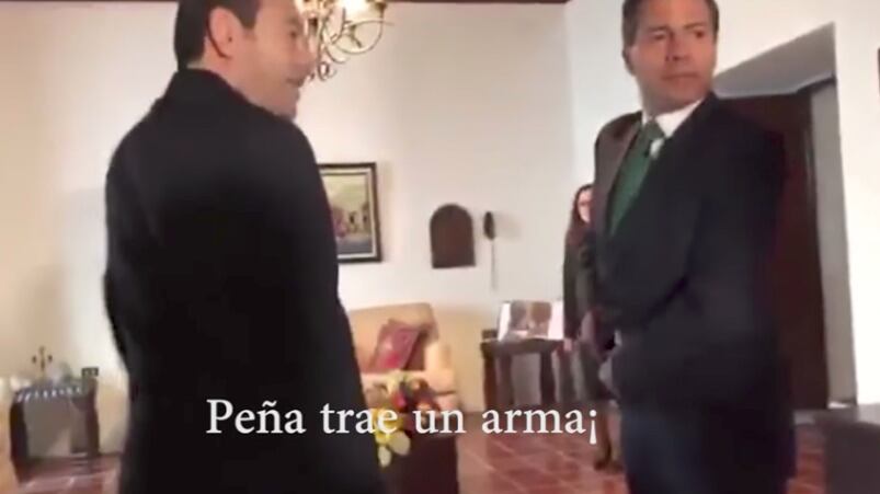 En las imágenes se observa cuando Peña Nieto se coloca la mano entre el saco, a la altura de la cintura, y le entrega un objeto a un personal de su comitiva. Sin embargo, no se ve con claridad que se trate de un arma.