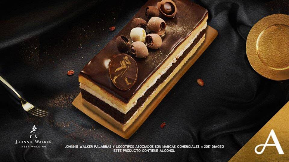Esta propuesta presenta un bizcocho rectangular de tres capas de vainilla y chocolate, un relleno cremoso con trocitos de macadamia y un toque de Johnnie Walker Gold Label Reserve. ¿Se te antoja?