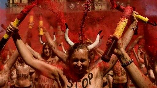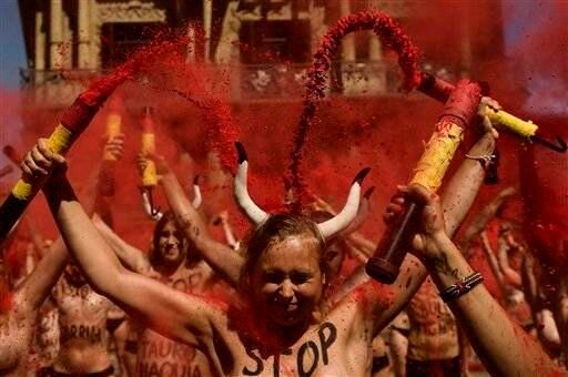 Bajo el grito de "¡Tauromaquia, abolición!" y disfrazados con cuernos falsos, los manifestantes se quitaron la ropa y se cubrieron con polvos rojos para protestar en contra de las actividades taurinas en los sanfermines.