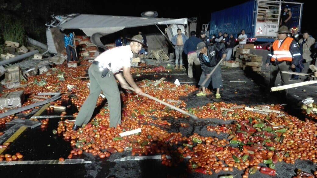 El camión iba cargado con verduras, las cuales quedaron botadas en la carretera. El percance obstruyó por completo los carriles con dirección hacia Escuintla.