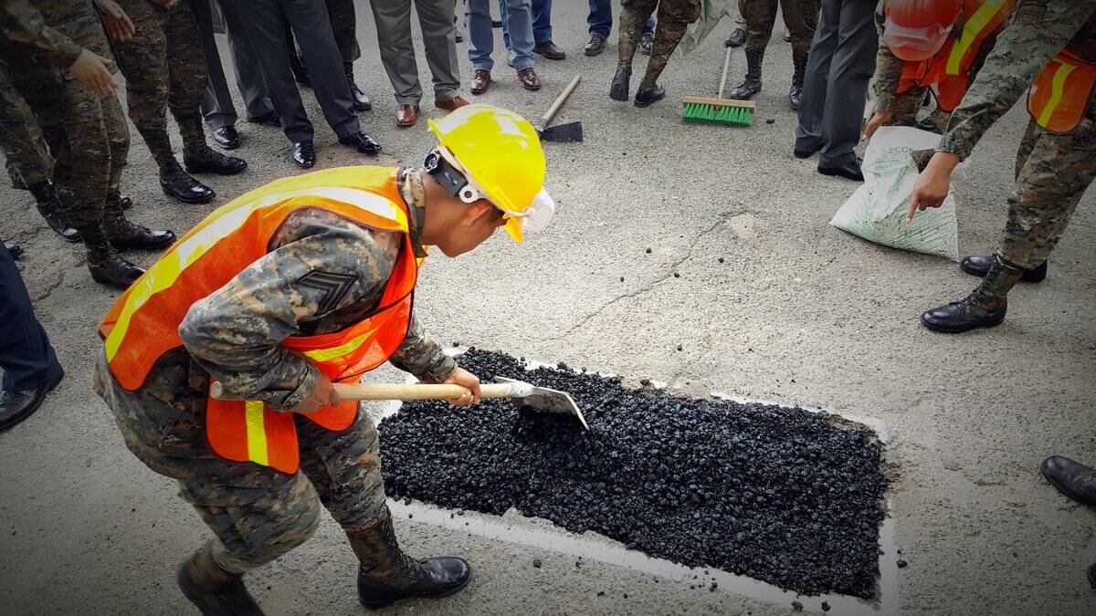 Personal del Cuerpo de Ingenieros del Ejército realizó hoy ante las autoridades una demostración de cómo se rellena un bache.