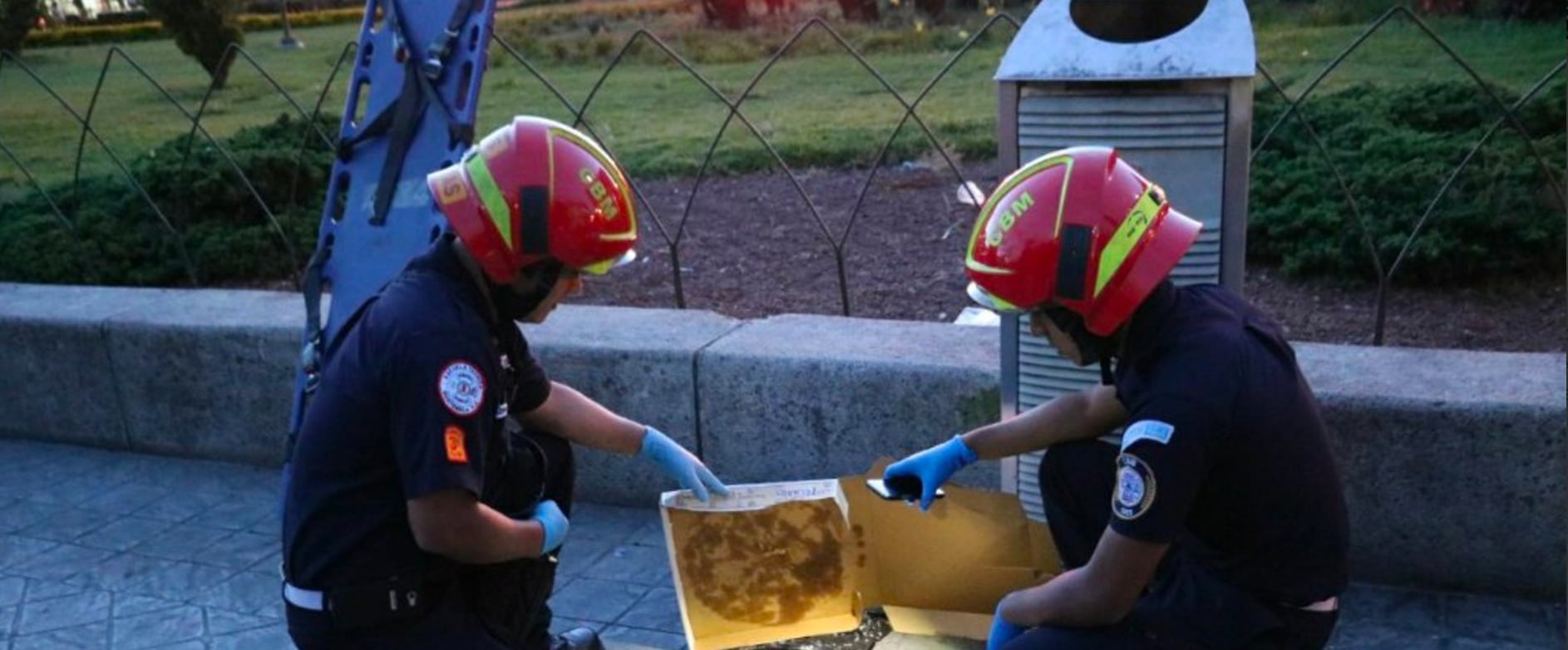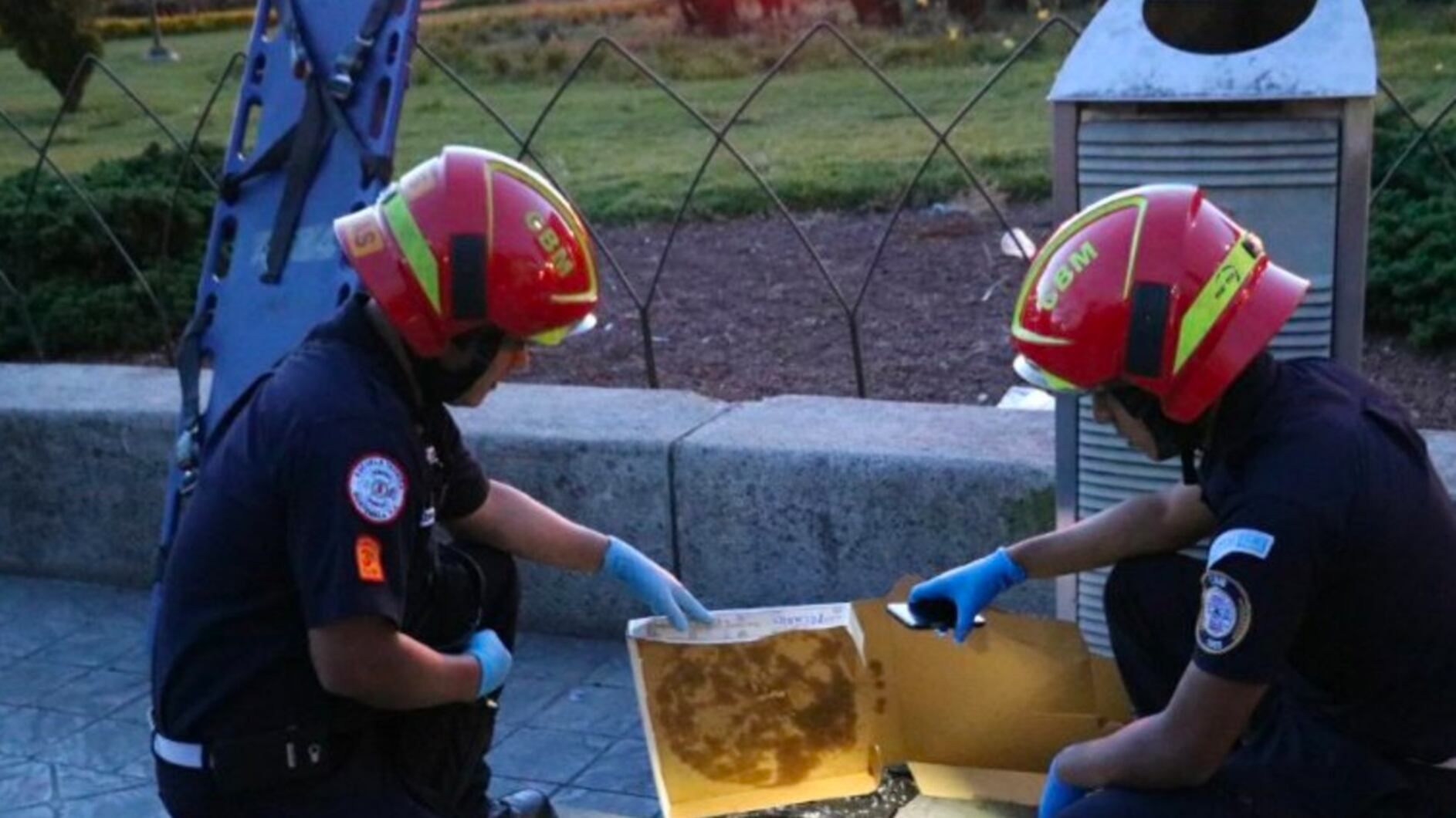 Los Bomberos Municipales compartieron una imagen en su cuenta de Twitter en la que se puede ver a los socorristas con la caja de cartón en las manos y en el suelo una mano humana.