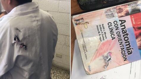 Según señala, el libro “Anatomía con orientación clínica”, logró detener una de las balas que se dirigió hacia el joven estudiante de medicina.