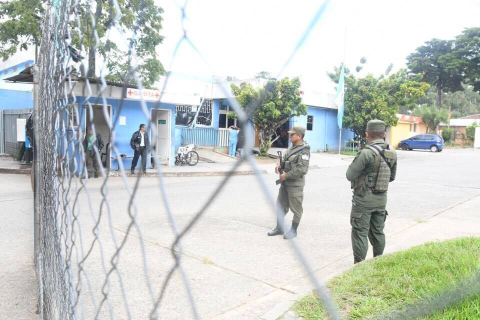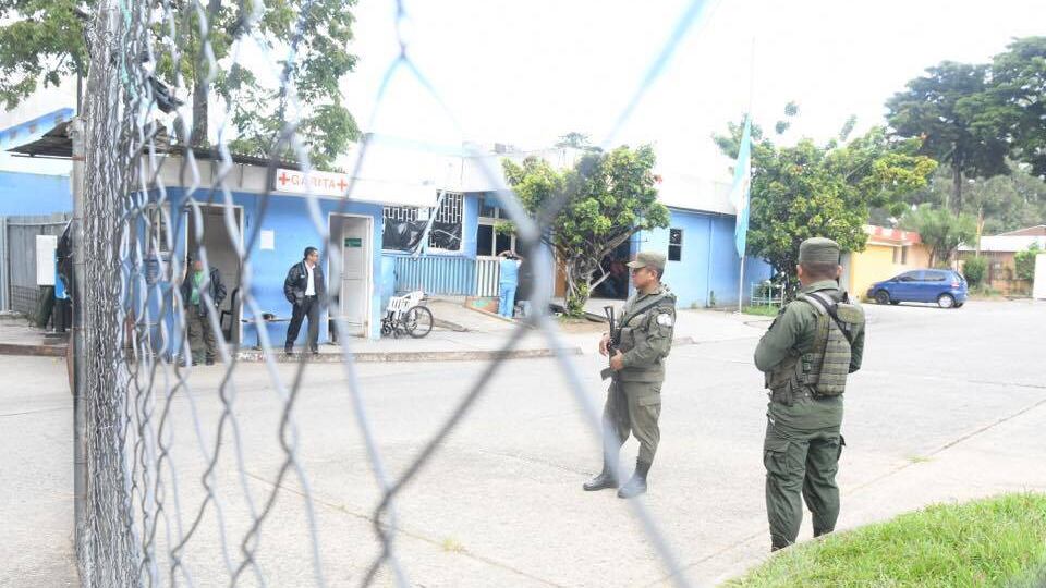 Agentes de la Policía Nacional Civil (PNC) y del Ejército de Guatemala brindan seguridad en el Hospital Roosevelt, a un día de que se registró un ataque armado en el que perdieron la vida siete guatemaltecos.